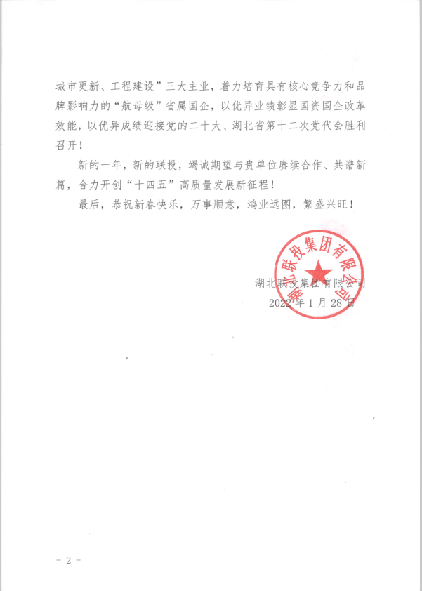 本網(wǎng)訊 1月28日,湖北聯(lián)投集團有限公司向河北省供銷合作總社發(fā)來感謝信,對雙方良好的合作表示高度贊揚,對河北省供銷社以往的大力支持表示衷心的感謝并致以新春的問候。作為河北省供銷系統(tǒng)龍頭企業(yè),河北省農(nóng)資集團今后將與湖北聯(lián)投集團進一步加強業(yè)務(wù)合作,拓展合作空間,實現(xiàn)合作項目的量級突破,強強聯(lián)手,互利共贏,共同創(chuàng)造新的輝煌。
