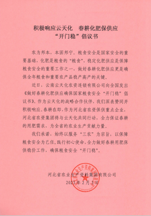 近日,云南云天化農(nóng)資連鎖有限公司向全國(guó)發(fā)出《做好春耕化肥供應(yīng)確保國(guó)家糧食安全“開門穩(wěn)”倡議書》。作為云天化的戰(zhàn)略合作伙伴,我們深表贊同并積極響應(yīng)。春耕在即,作為河北省農(nóng)資保供重點(diǎn)企業(yè),河北省農(nóng)資集團(tuán)將與云天化共同行動(dòng),全力保證春耕的用肥需求,為全省的農(nóng)業(yè)生產(chǎn)貢獻(xiàn)力量。