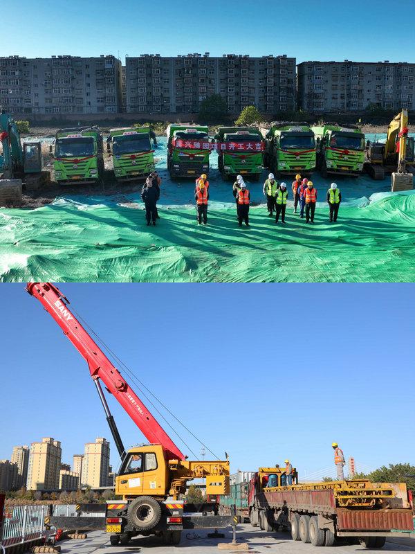 建設現(xiàn)場,機械引擎轟鳴,鉆機高聳入云,運輸車輛整齊劃一,全員蓄勢待發(fā)。