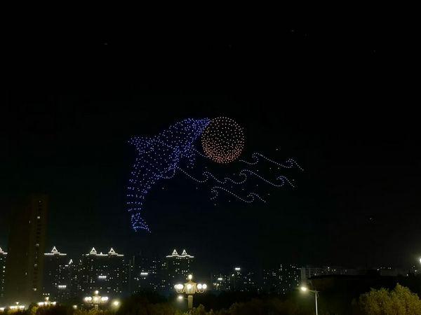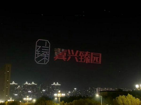 19點,無人機編隊表演拉開序幕。千架無人機如星河般升空,在夜空中排列出 “千年儒鄉(xiāng) 一湖靈秀”、“我愛衡水”、中國龍、鳳凰、藍鯨等多種圖案,將冀興臻園與城市共進、共建理想家園的美好遠景集中呈現(xiàn)。
