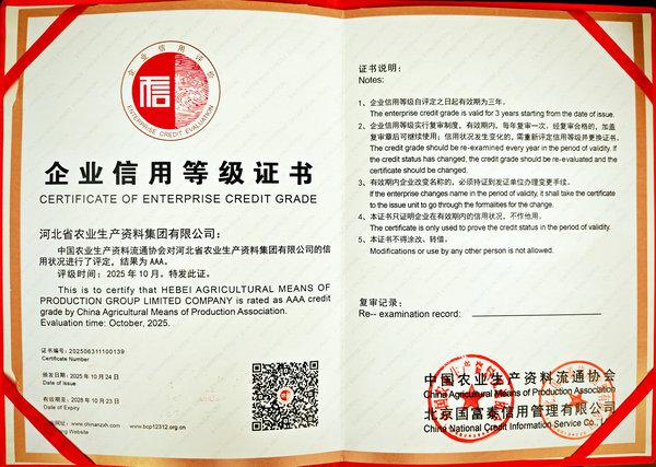 本網(wǎng)訊 11月4日,中國(guó)農(nóng)業(yè)生產(chǎn)資料流通協(xié)會(huì)在江蘇省南京市召開“2025年度中國(guó)農(nóng)資經(jīng)銷商年會(huì)”。會(huì)上發(fā)布了“2024/2025中國(guó)農(nóng)資流通行業(yè)發(fā)展報(bào)告”,公布了2025年度中國(guó)農(nóng)資流通企業(yè)信用等級(jí)評(píng)價(jià)結(jié)果、2025年度農(nóng)資流通企業(yè)競(jìng)爭(zhēng)力評(píng)價(jià)及農(nóng)資行業(yè)知名品牌認(rèn)定結(jié)果。集團(tuán)公司被評(píng)為“AAA級(jí)信用企業(yè)”,同時(shí)榮獲“2025年度農(nóng)資流通企業(yè)競(jìng)爭(zhēng)力AAAA級(jí)”,“冀農(nóng)”品牌被評(píng)為‘“AAA”級(jí)農(nóng)資行業(yè)知名品牌(產(chǎn)品類)。